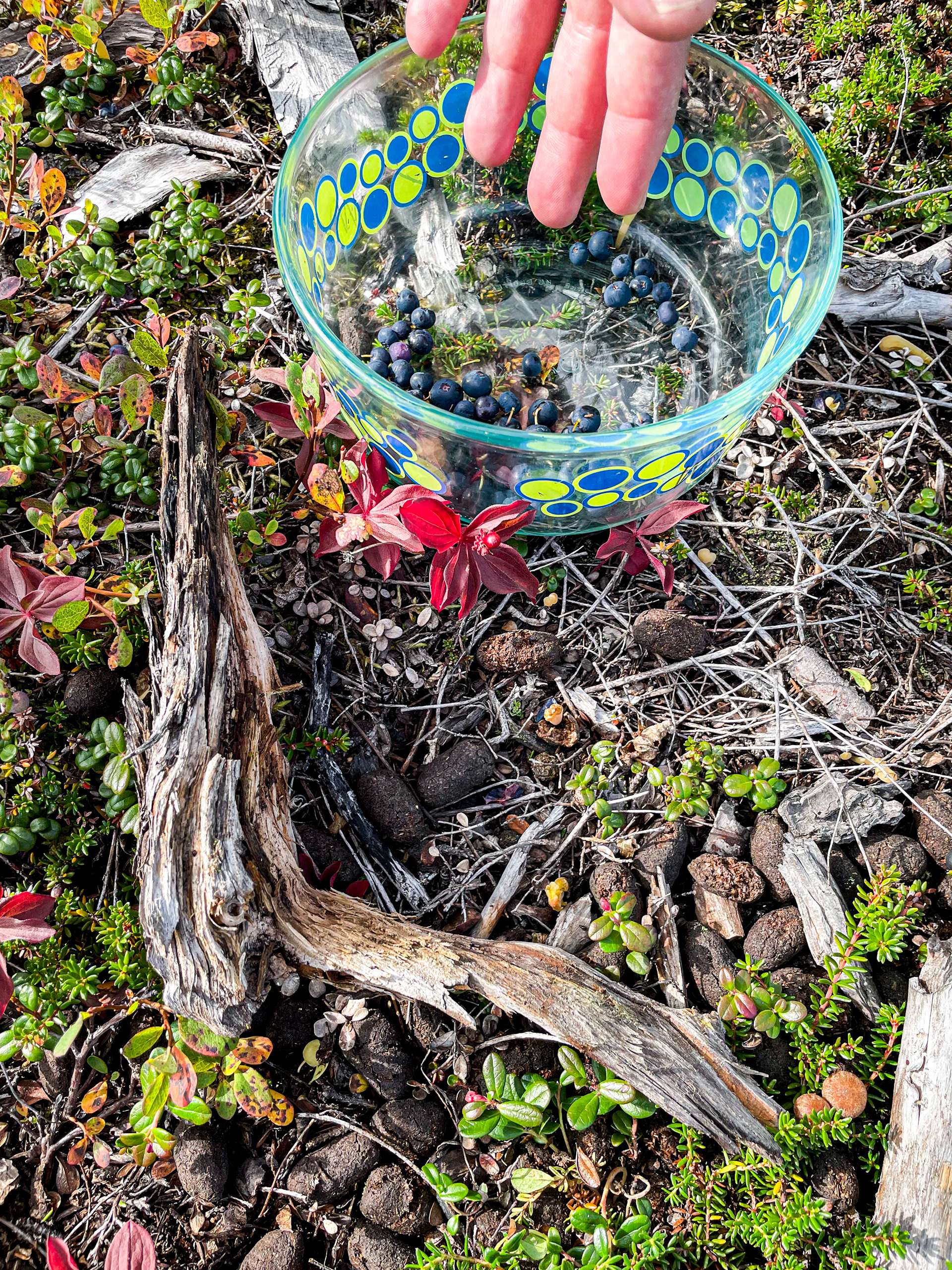 We went hiking/foraging with our friend who knows what and how to look for. Crowberries were everywhere, blueberries were there if you looked hard enough, and high bush cranberries (lingonberries) were tough but possible.